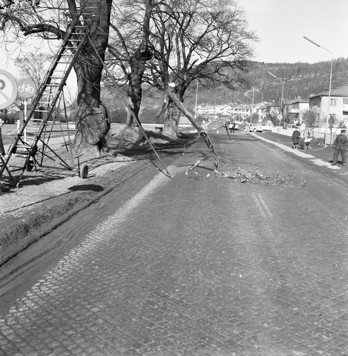 Trädgren sågas bort utanför Kroatorpet på Grännavägen i Huskvarna.1960-tal.