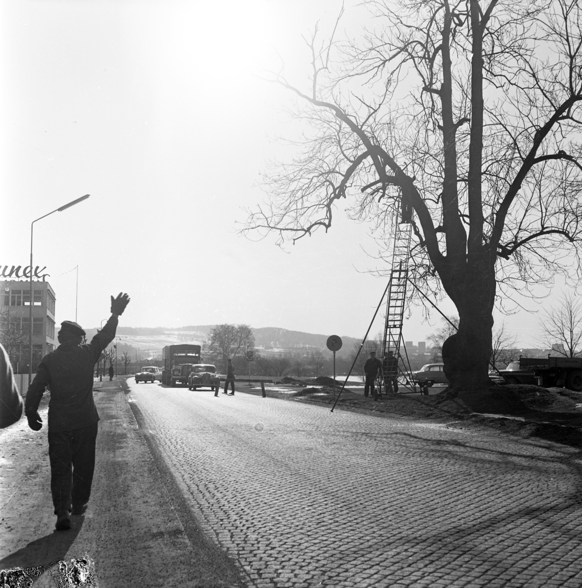 Träd sågas ned vid Junexfabriken i Huskvarna. 1960-tal.