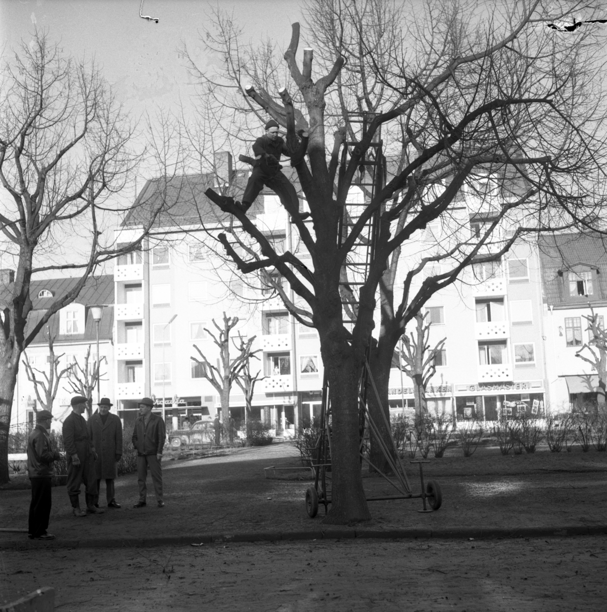 Trädklippning på Esplanaden i Huskvarna. Biografen Arcadia i bakgrunden.