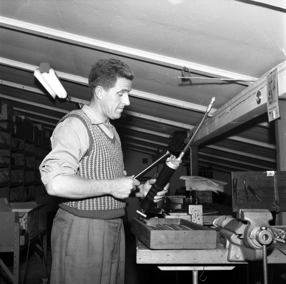 Porträtt av Holger Johed i sin verkstad, Joheds Mekaniska Verkstad, på Linnégatan i Huskvarna. Den flyttade senare upp till Öxnehaga i Huskvarna.