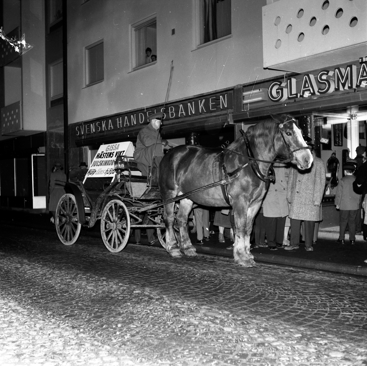Åkare Olle Andersson kallades mest Olle Smé eftersom han var bror till smederna vid Kavlaplan i Huskvarna. Här står han med sin häst Fyr som har en tävlingsskylt på vagnen. Hästen drog bl a Kroatorpet till sin nuvarande plats år 1951. Olle Andersson var den siste som körde yrkesmässigt med häst och vagn i Huskvarna.