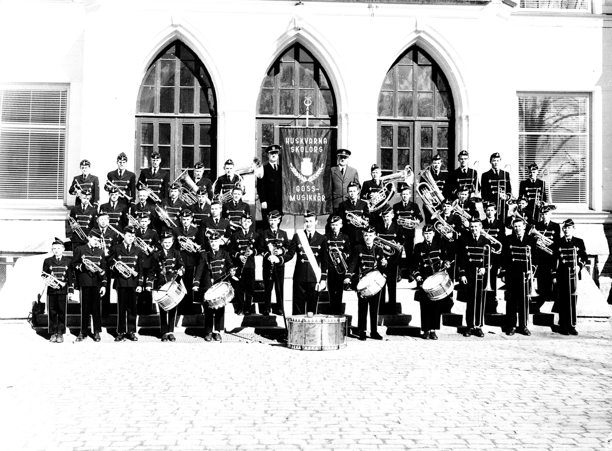 Huskvarna Skolors Gossmusikkår på skoltrappan den 17 april 1955.