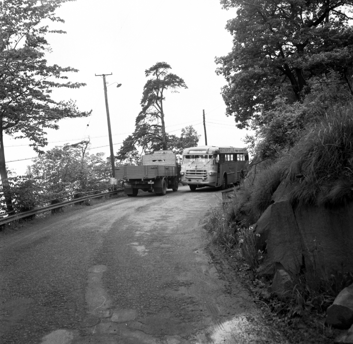 Fordon som möts i korsningen mellan Smedstorpsgatan och Ådalsvägen, den s k " Blindtarmen", i Huskvarna den 4 juni 1964.