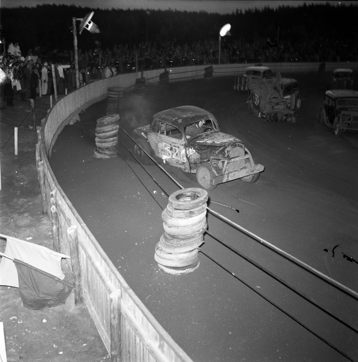 Tävling i stockcar på Junexvallen i Huskvarna den 1 maj 1955. Hemmaföraren Åke Gustafsson har just kört på en bil bakifrån så att den hamnat på taket.