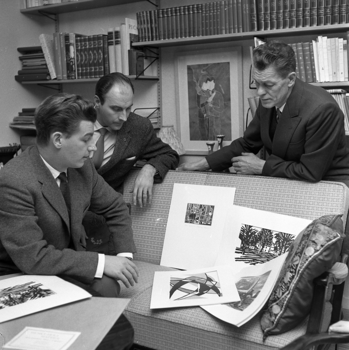 2 herrar hemma hos Stig Jonsson som tittar på konst den 28 december 1962.