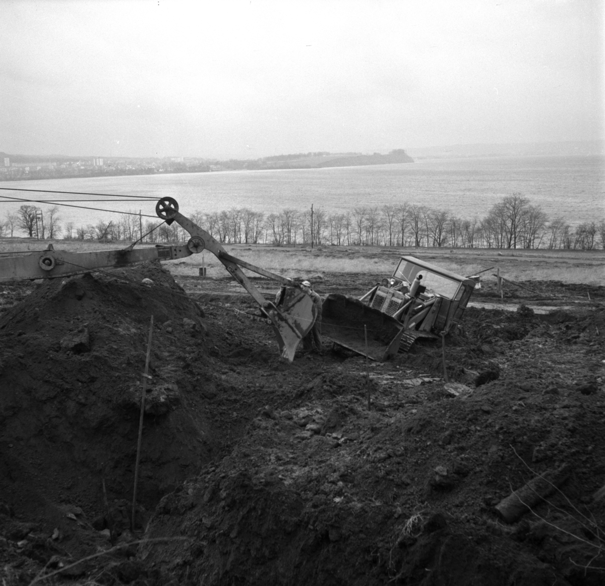 Traktor har kört ner sig vid byggnation på Norrängen i Huskvarna på 1960-talet.