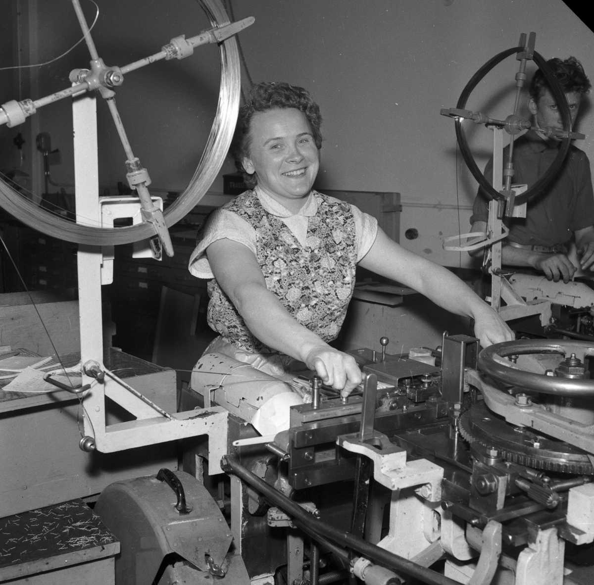 En kvinna sitter vid en maskin på Huskvarna Borstfabrik och arbetar.