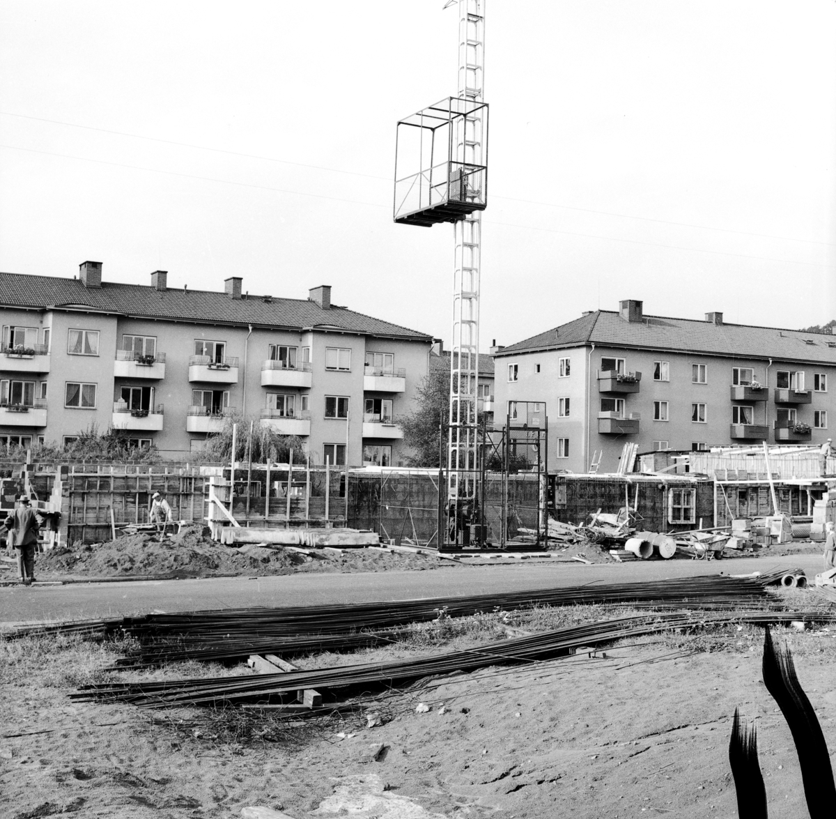 Nytt bygge i Huskvarna. Byggarbetsplats med ny hiss.