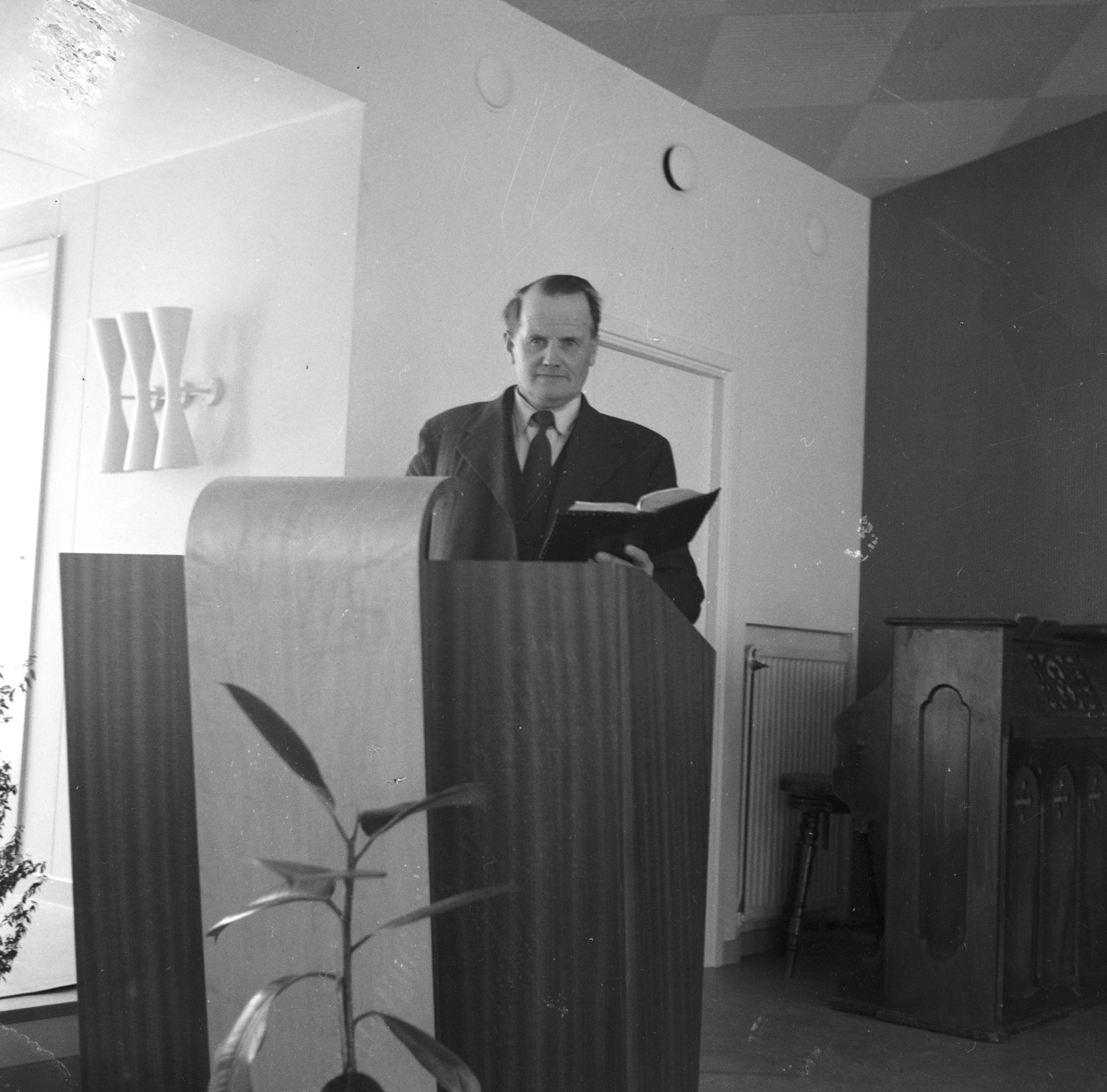 En skogsarbetare talar i predrikstolen i Huskvarnas Baptistkyrka.