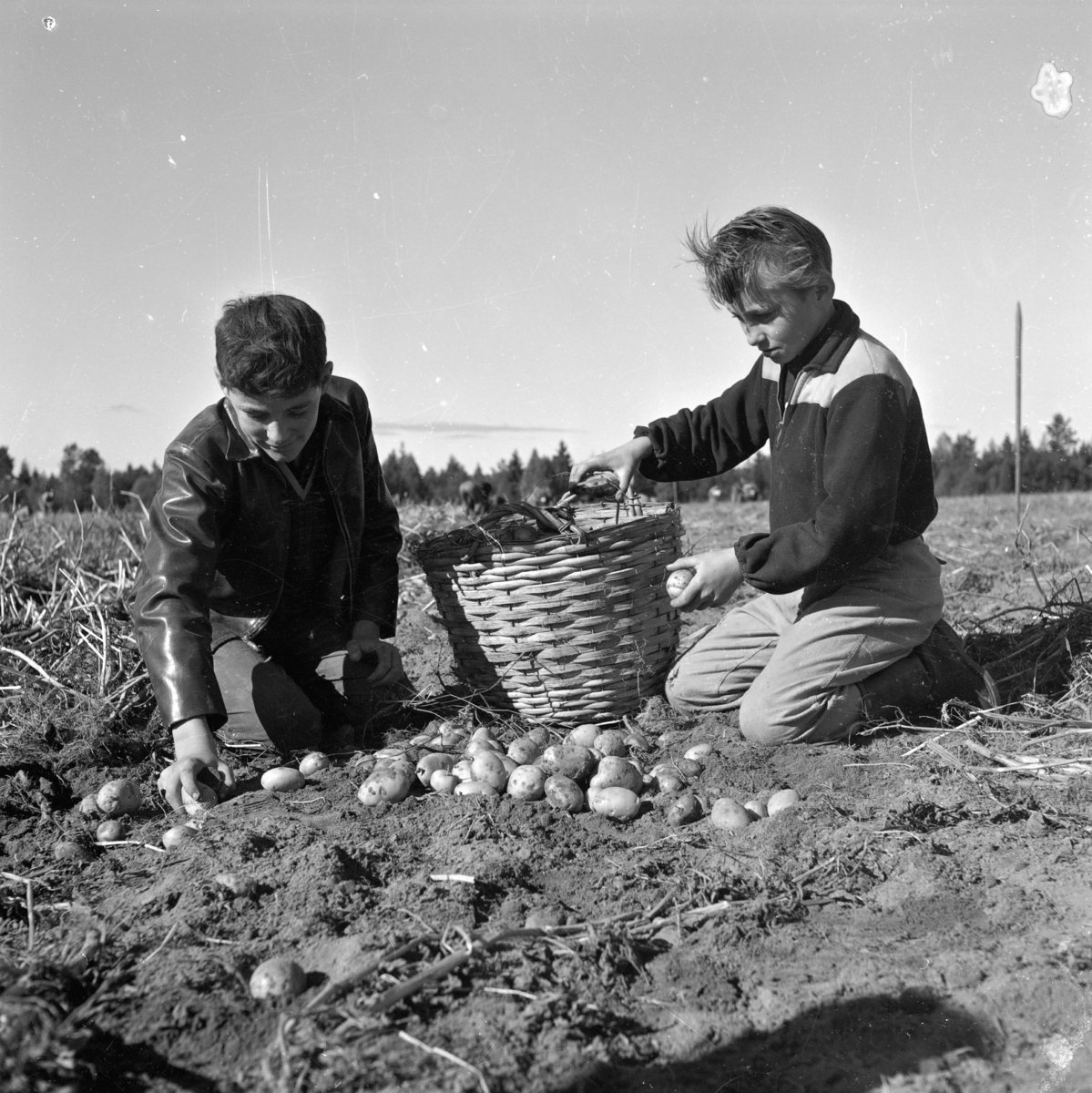 Två pojkar plockar potatis på ett fält den 25 september.