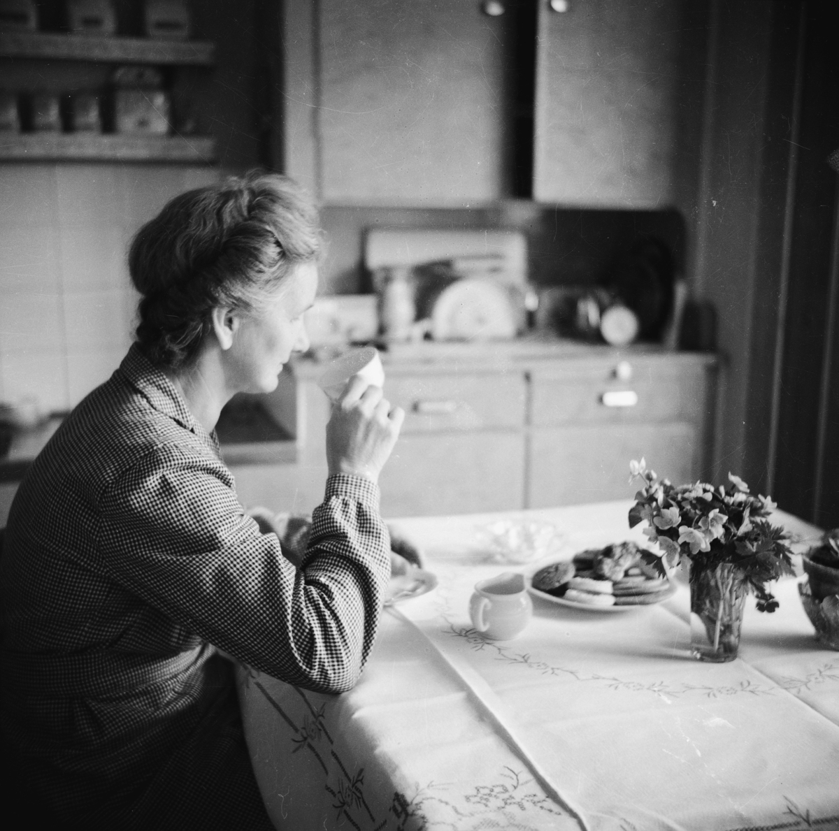 En kvinna sitter med en kopp vid ett uppdukat bord.