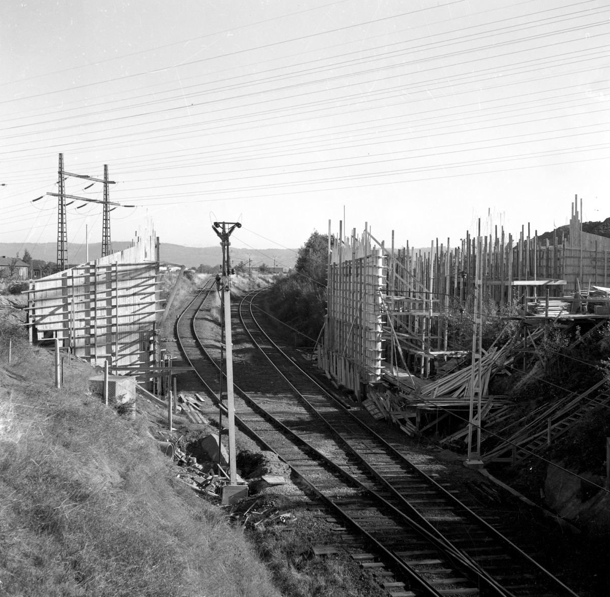 Bron över järnvägen vid Ekhagsrondellen i höjd med Kjellbergsgatan på Rosenlund i Jönköping under byggnad. Det högra järnvägsspåret är banan till Nässjö, det vänstra industrispåret till Huskvarna. Ledningar till Vattenfalls transformatorstation i bakgrunden.