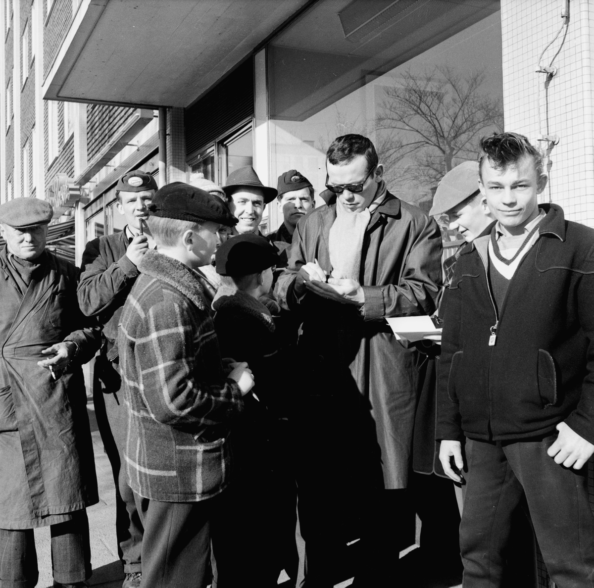 Boxaren Ingemar Johansson står utanför Kungsgatan 14 i Jönköping och skriver autografer.