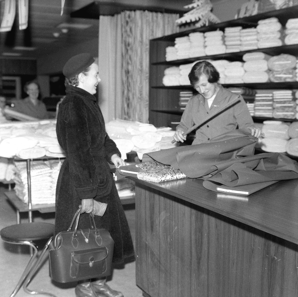 En kvinna står i tygaffären och tittar på när expediten mäter upp tyg.