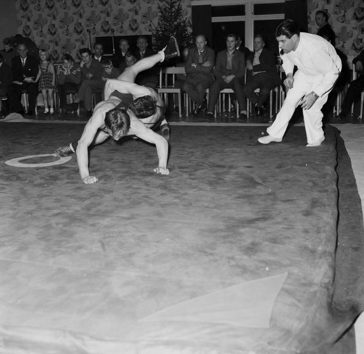 En man från Huskvarna brottningsklubb (HAIK) brottas med en motståndare från Nybro.