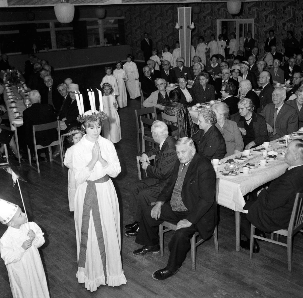 Ett Luciatåg underhåller pensionärer i Huskvarna Folkets park.
