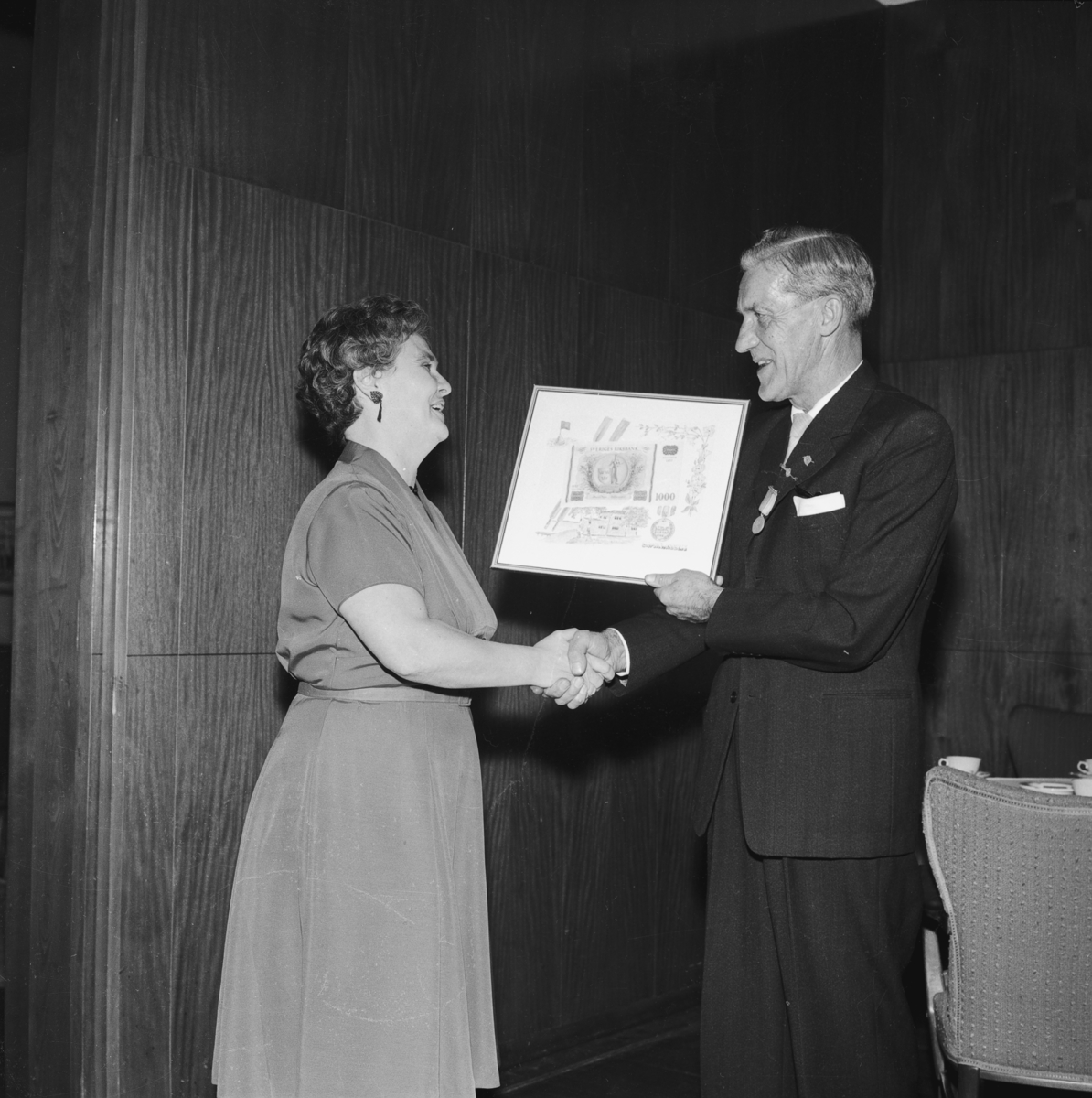 En man lämnar över ett pris till en kvinna i samband med en prisutdelning.