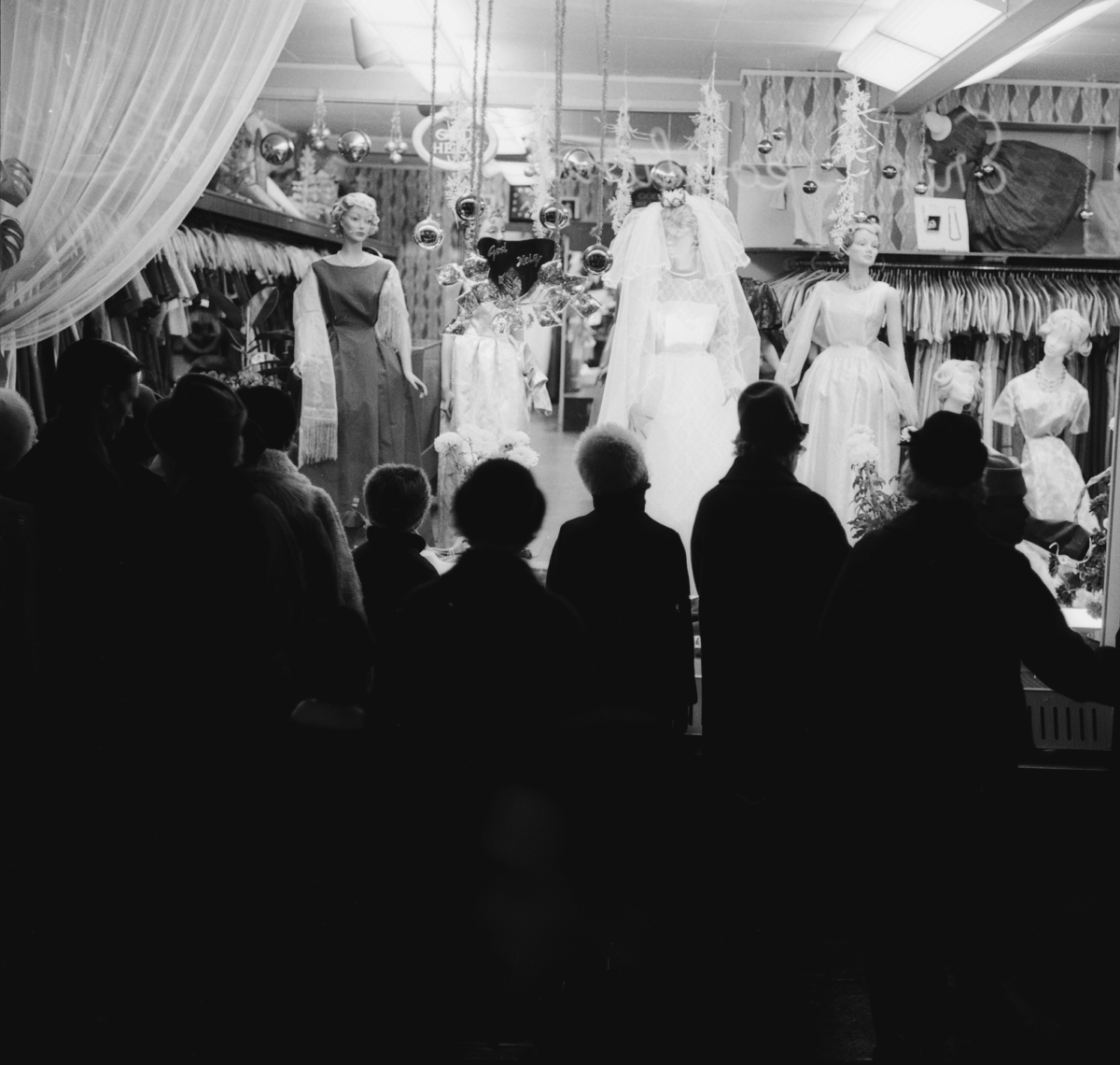 Det är söndag och människor står och tittar in i ett butiksfönster på julskyltningen.