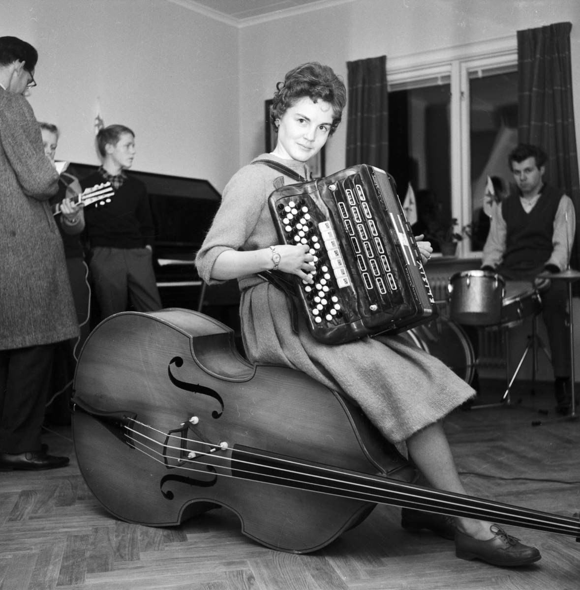 Medlemmar i IOGTs ungdomsorkester, en kvinna spelar dragspel. År tidigt 60-tal