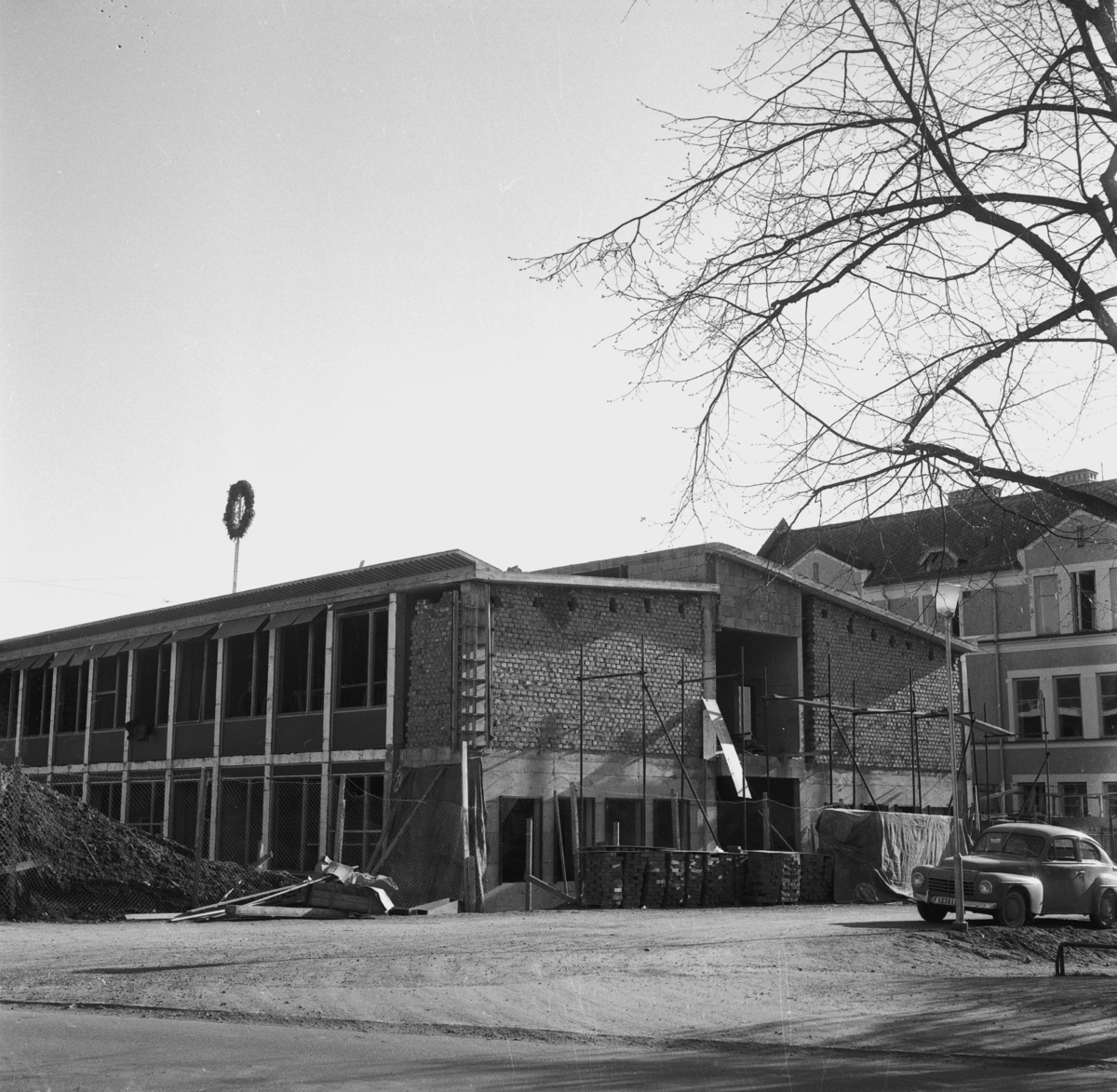 En del av Centralskolan i Huskvarna under uppbyggnad. Kransen på taket visar att det är dags för taklagsfest.