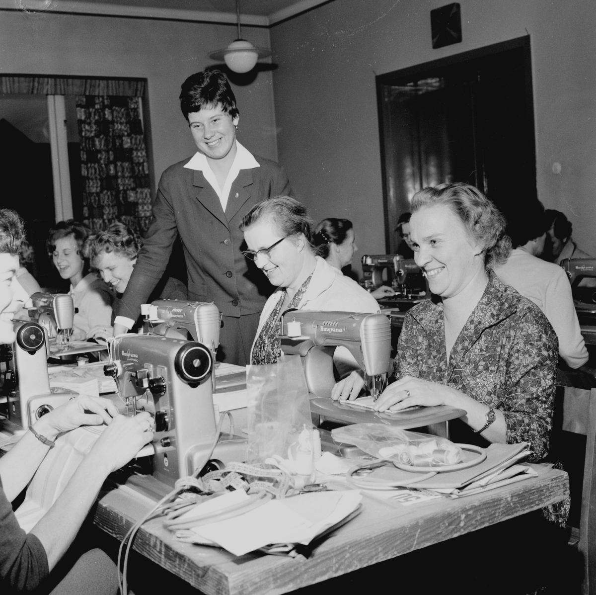 Kvinnorna är på kurs i sömnad och syr på Husqvarna symaskiner i folkets hus den 13 november.