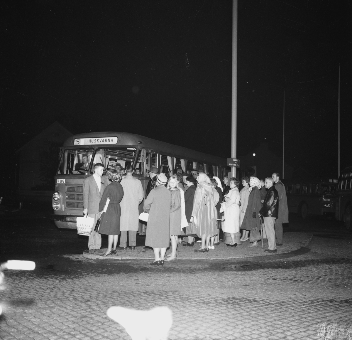 En grupp människor står vid en buss på esplanaden i Huskvarna.
