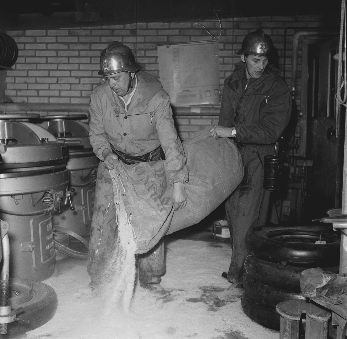 Två brandmänn tömmer innehållet från en säck på golvet.