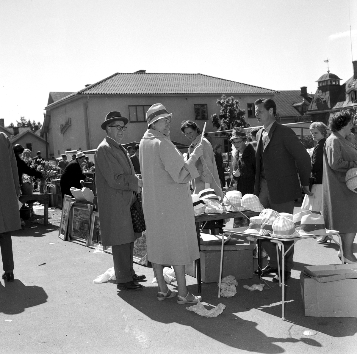 En kvinna står och provar en hatt vid ett marknadsstånd på Elverksplan i Huskvarna.