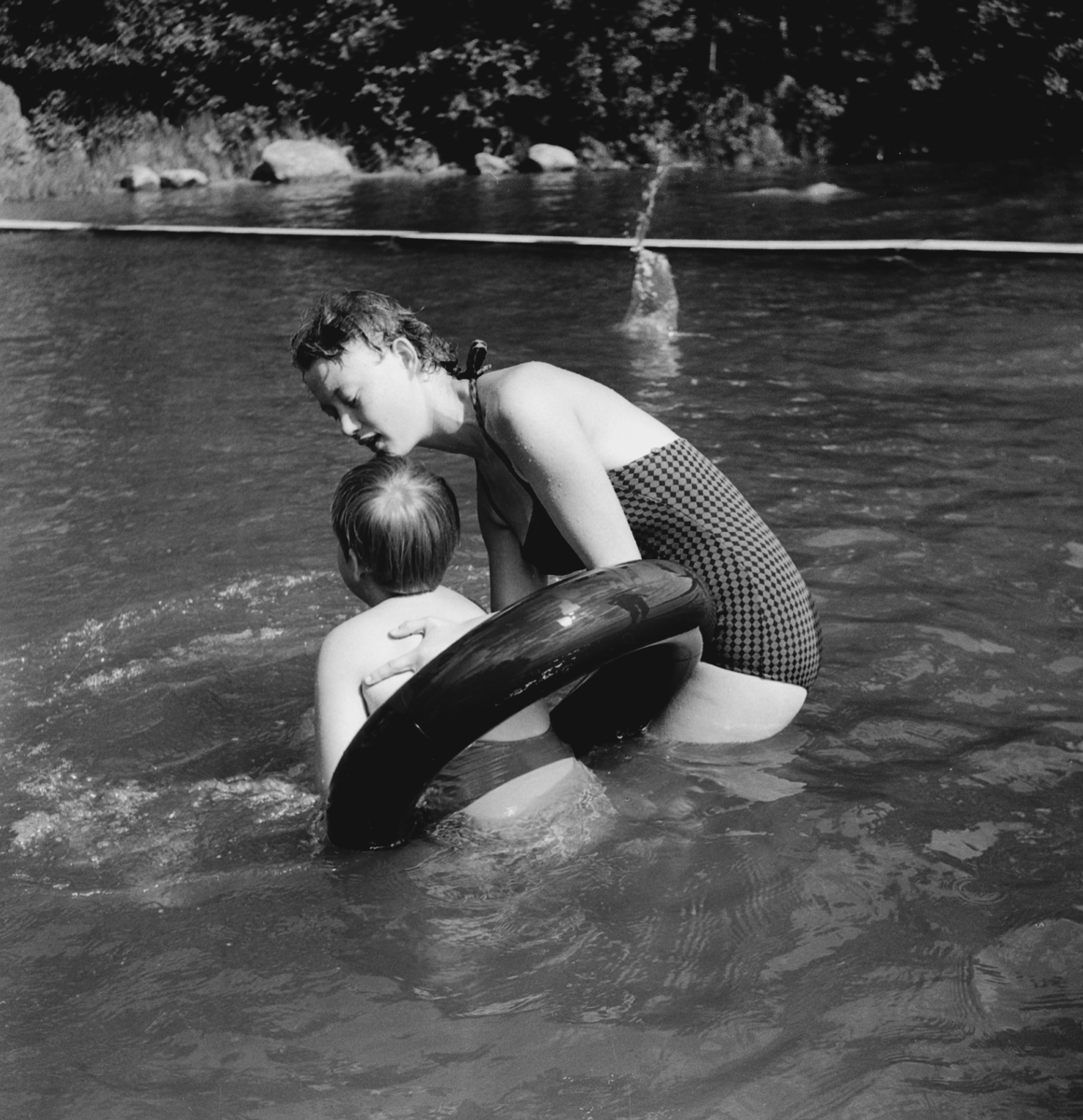 Ett barn får simundervisning i Rogbergasjön utanför Jönköping.