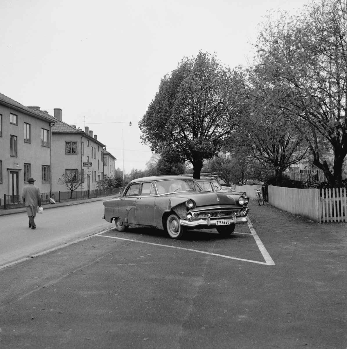 Utmed jönköpingsvägen står bilar pakerade. I det mittersta huset står det på en skylt, Huskvarnas hemslöjd.