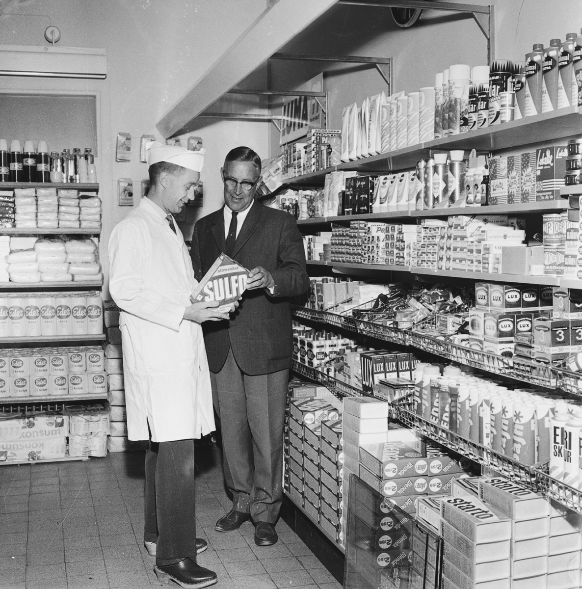 Konsumchefen Friberg står och tittar på en vara i affären i Huskvarna.