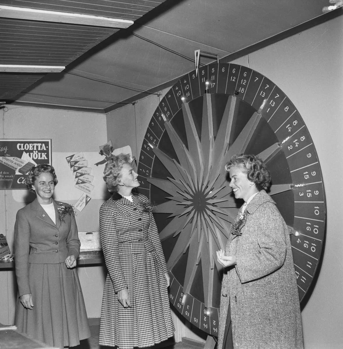 Tre systrar, Dagmar, Ulla och Berit Thor, står vid chokladhjulet i Huskvarnas Folkets park.