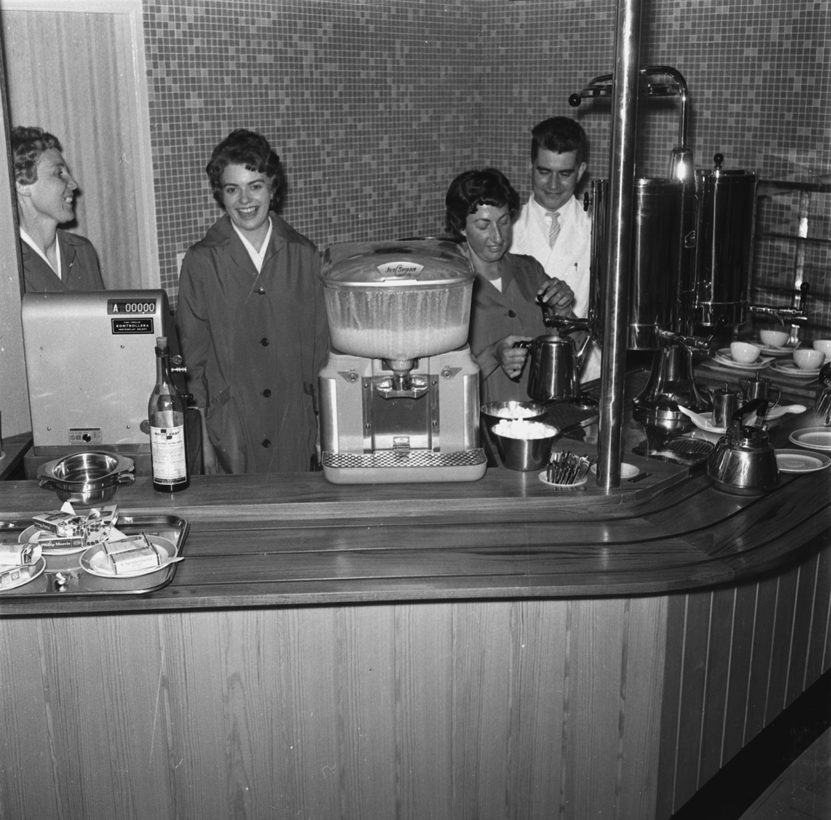 En kvinna fyller på kaffe, i en kanna vid serveringsdisken, vid öppnandet av varuhuset EPA i Huskvarna.