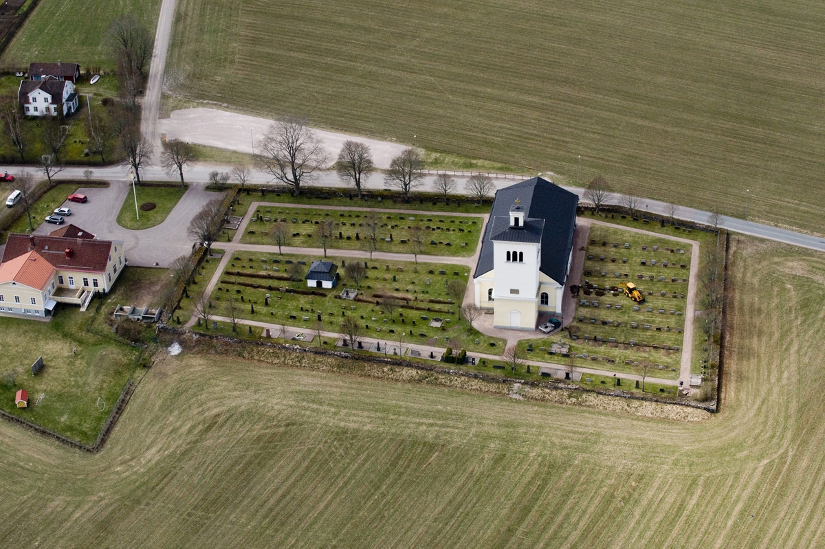 Titel: Flygfoto över Adelövs kyrka i Tranås kommun.
