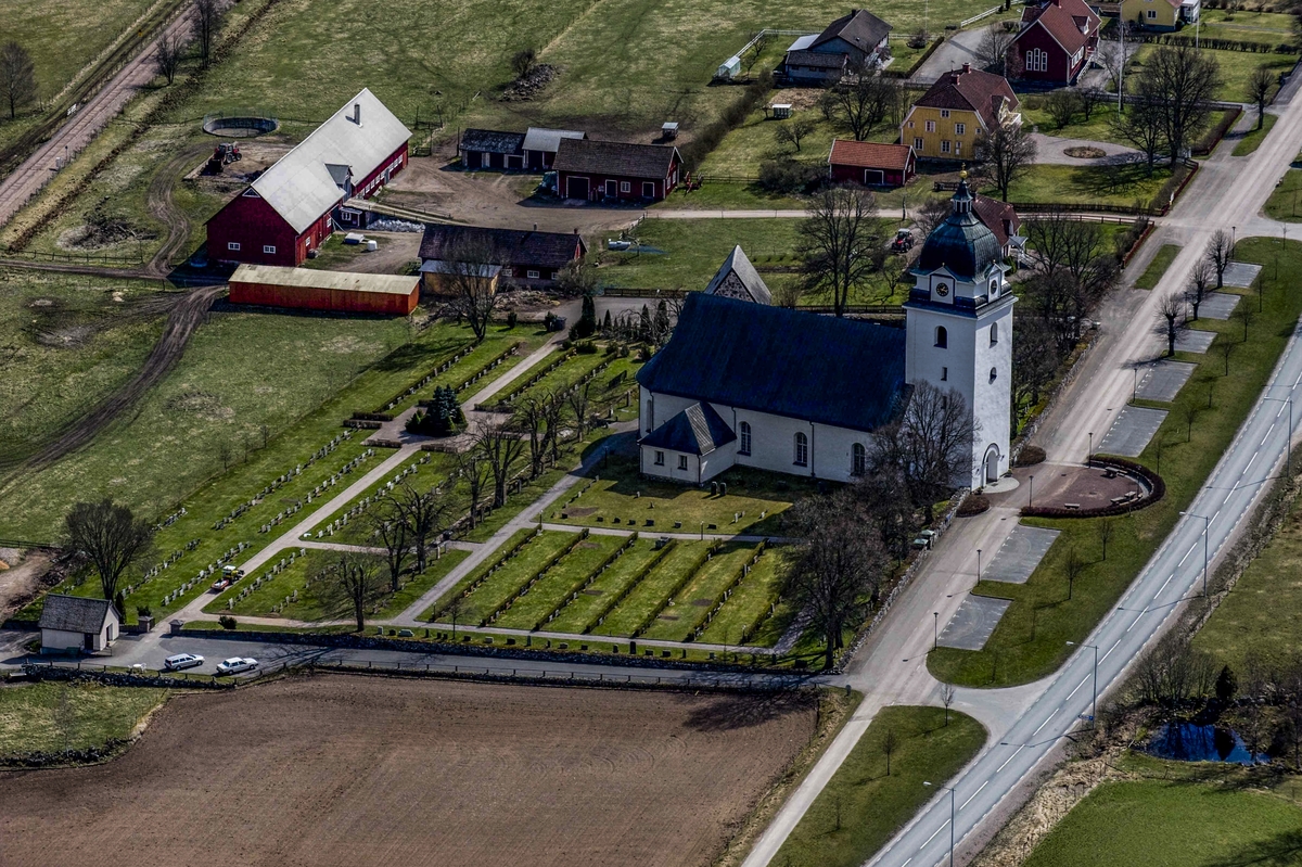 Titel: Flygfoto över Alseda kyrka i Vetlanda kommun.