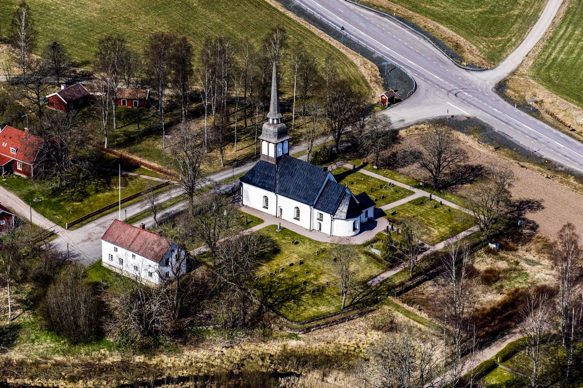 Titel: Flygfoto över Bredestad kyrka i Aneby kommun.