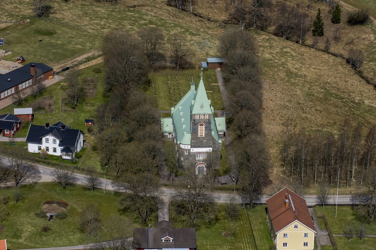Flygfoto över Bäckaby kyrka i Vetlanda kommun.