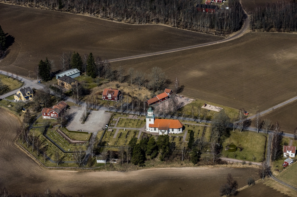Titel: Flygfoto över Gustav Adolfs kyrka i Habo kommun.