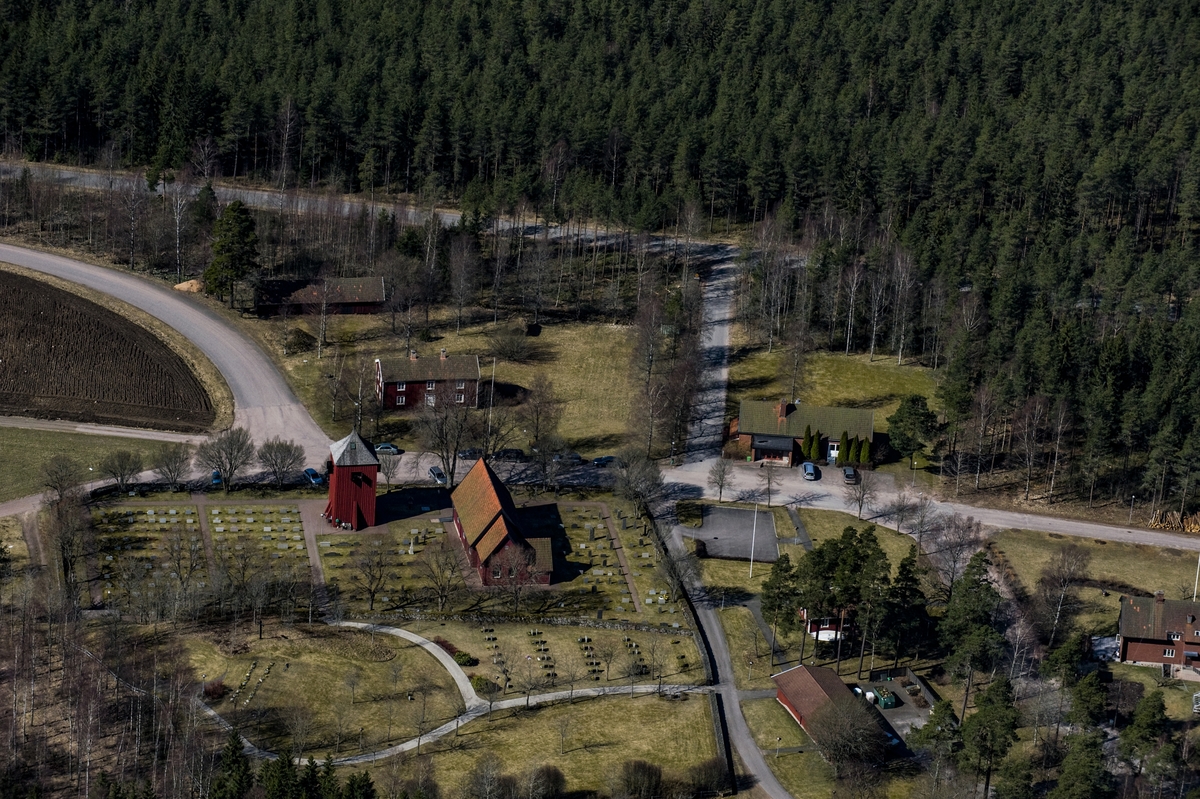Flygfoto över Norra Hestra kyrka i Gislaveds kommun.
