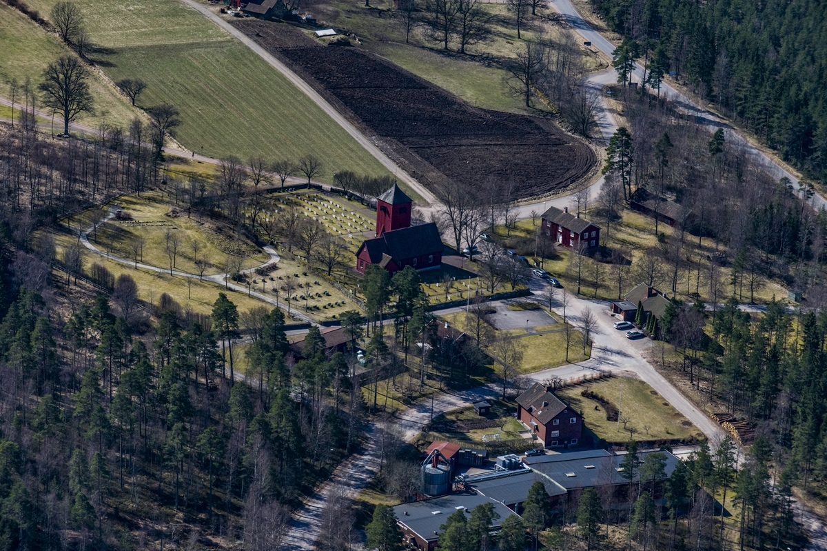 Flygfoto över Norra Hestra kyrka i Gislaveds kommun.