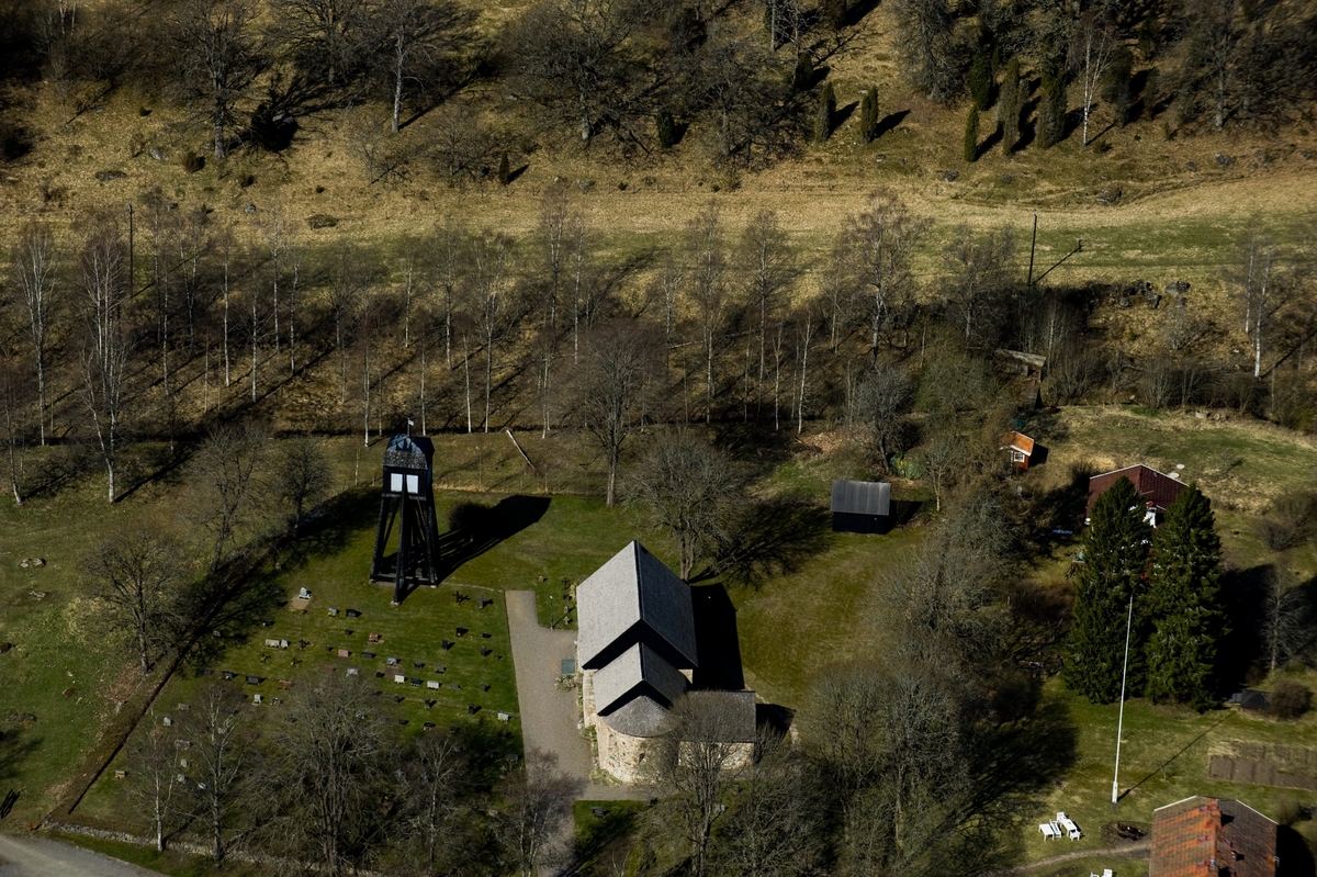 Titel: Flygfoto över Hjälmseryds gamla kyrka i Sävsjö kommun.