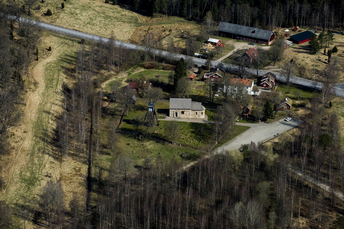 Flygfoto över Hjälmseryds gamla kyrka i Sävsjö kommun.