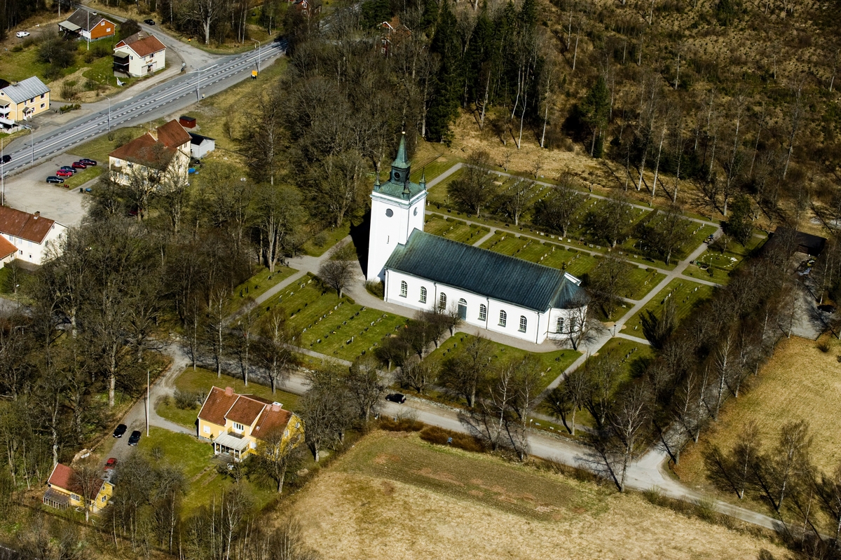 Flygfoto över Nya Hjälmseryds kyrka i Sävsjö kommun.