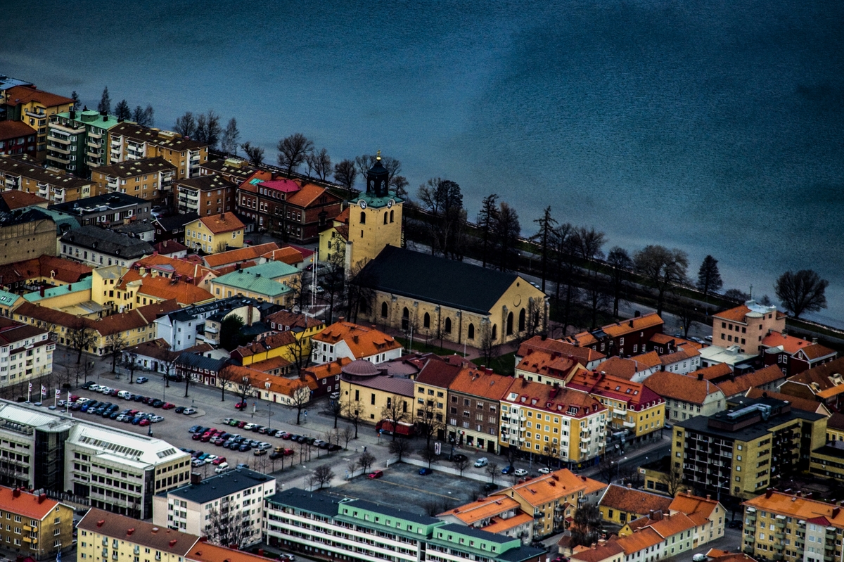 Flygfoto över Jönköpings centrum med Östra torget och Kristine kyrka.