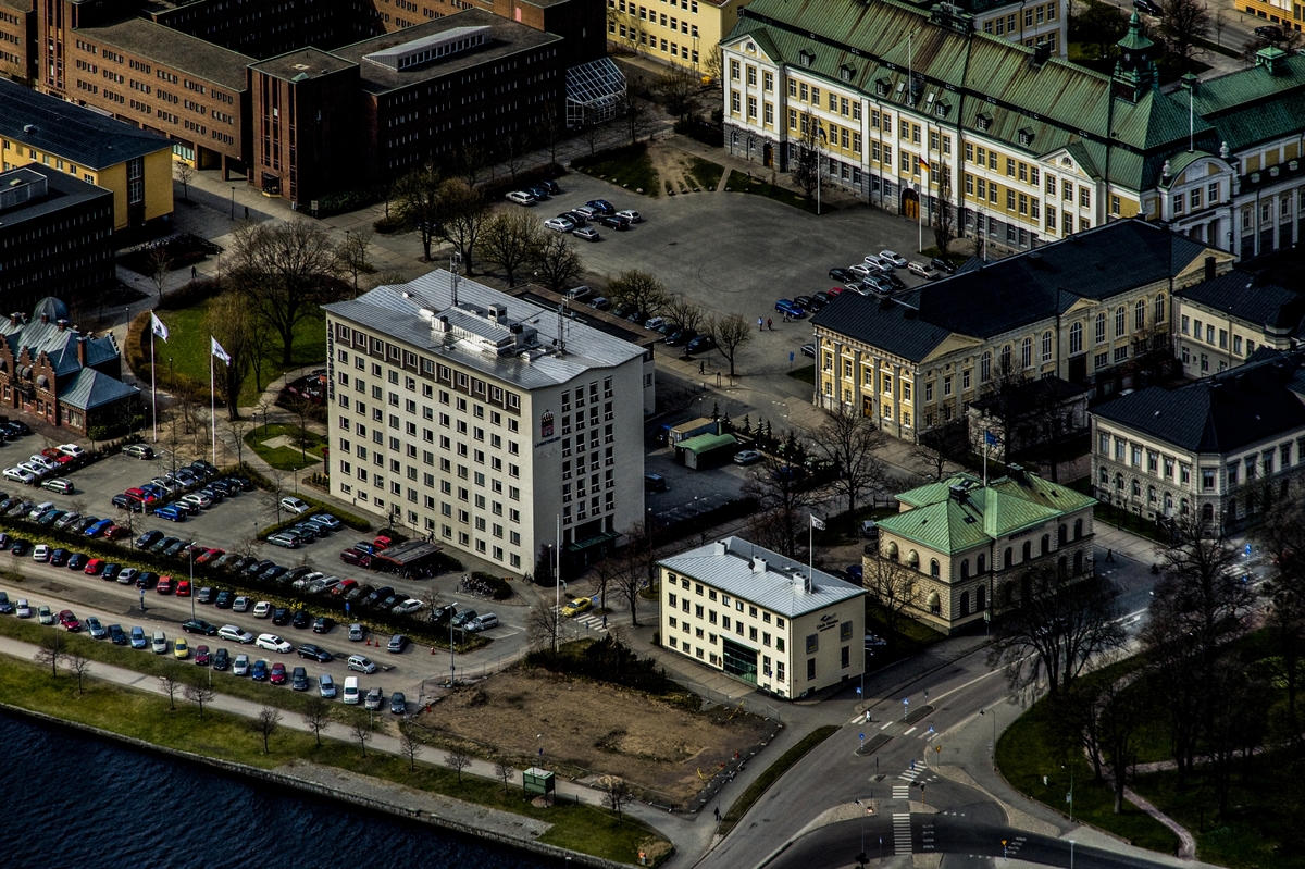 Flygfoto över Jönköpings centrum, Per Brahegymnasiet och länsstyrelsen.