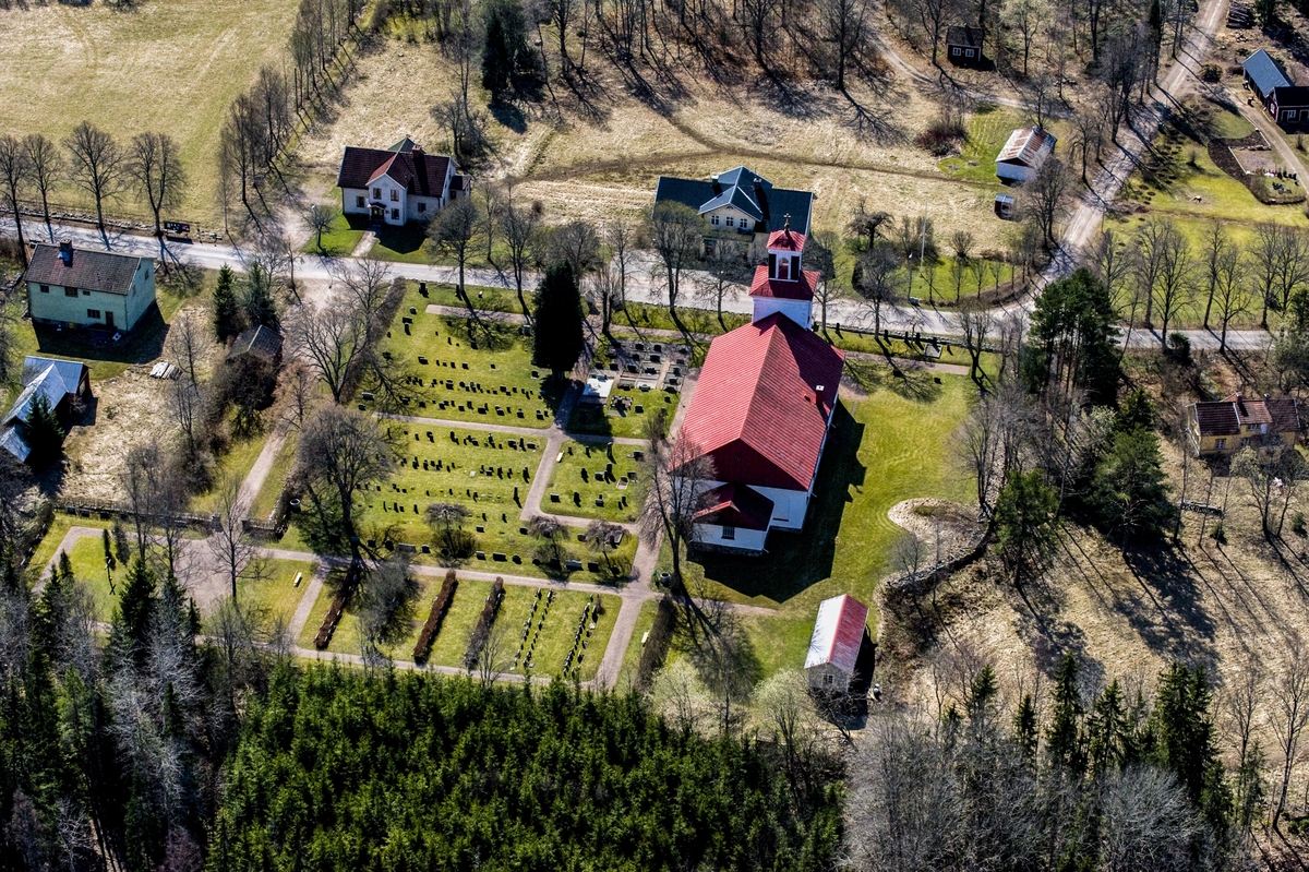 Titel: Flygfoto över Kråkshults kyrka i Eksjö kommun.
