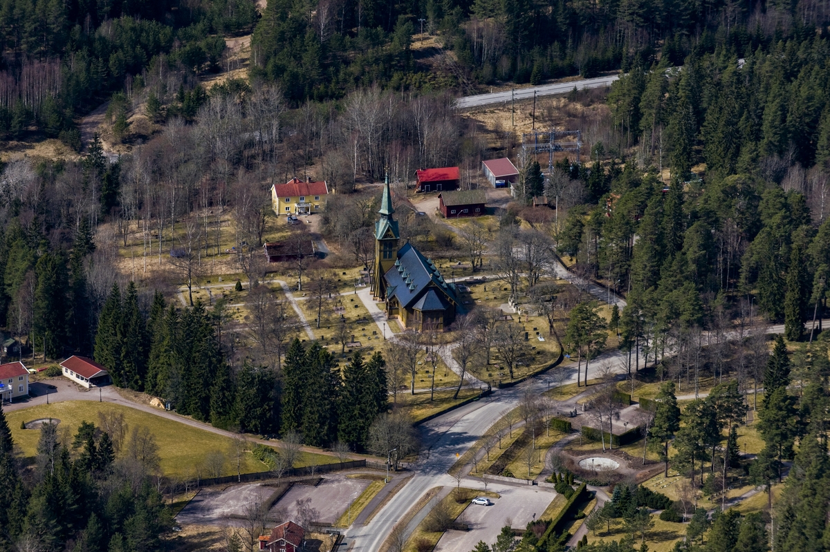 Titel: Flygfoto över Nykyrka kyrka i Mullsjö kommun.
