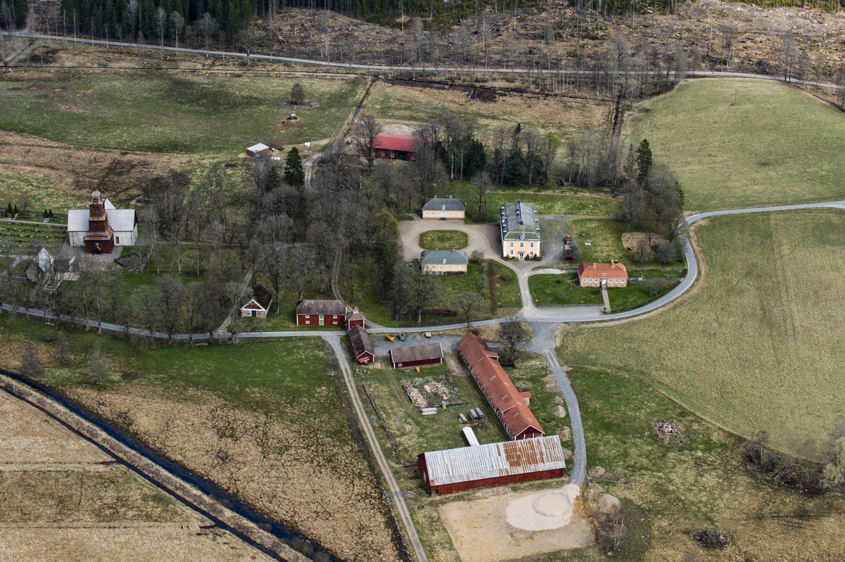 Flygfoto över Nydala säteri i Värnamo kommun. Till vänster ligger Nydala kyrka.