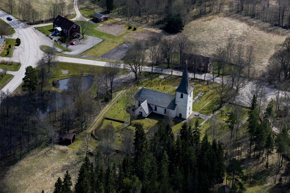 Titel: Flygfoto över Nye kyrka i Vetlanda kommun.