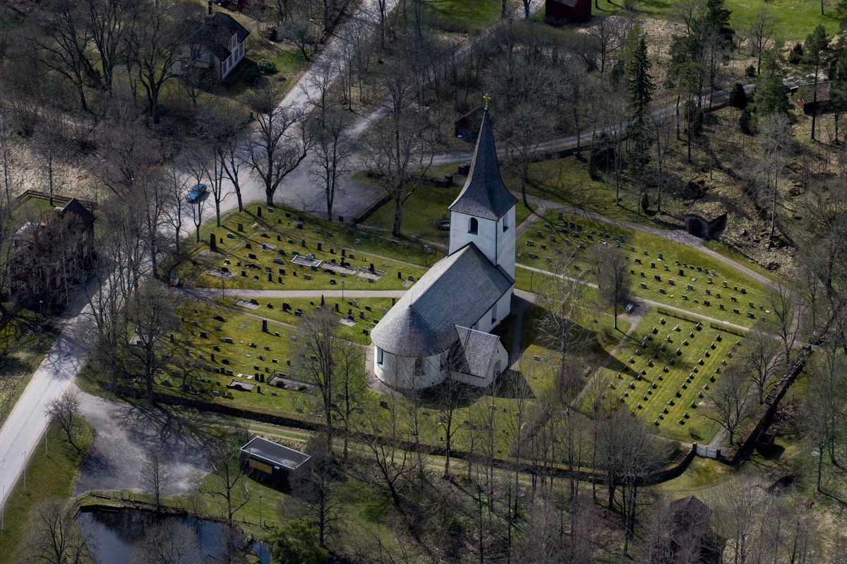 Flygfoto över Nye kyrka i Vetlanda kommun.